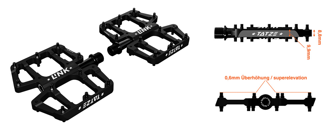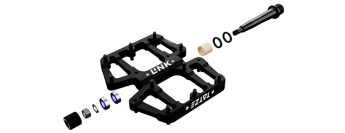 Das LINK-Pedal ist ein extrem dünnes Flat-Pedal. Die große Plattform mit 112cm2 (113x99mm/LxB) und 40 TATZE PINs mit gezielter Überhöhung sorgen für enormen Grip und eine gute Verbindung zwischen Pedal und Schuh. Um den Grip weiter zu erhöhen bzw. die Kontaktfläche zu maximieren, können zusätzlich 4 PINS pro Seite eingeschraubt werden. Unerwünschten Bodenkontakt vermeidet das LINK durch seine extrem dünne Bauweise, so hat der Pedalkörper an der exponierten Außenkante nur 8,8mm und damit ist das LINK eines der dünnsten Pedale auf dem Markt. Das offene Design lässt Schmutz durch das Pedal fallen und macht das Pedal mit nur 343g zum Leichtgewicht. Das LINK ist hochwertig gelagert, verbaut wird dabei ein IGUS JSM Gleitlager und 2 Kugellager. Zur Abdichtung sind 2 Doppellippendichtringe eingebaut, die die Lager vor Schmutz und Feuchtigkeit schützen. Die Lager- und Dichtungseinheit macht das Pedal nachhaltig im Sinne einer langen Lebensdauer. Zudem können Lager und Dichtungen mit dem optional erhältlichen Refresh-Kit in 5 Minuten erneuert werden, um die Uhr wieder auf 0 zu stellen.