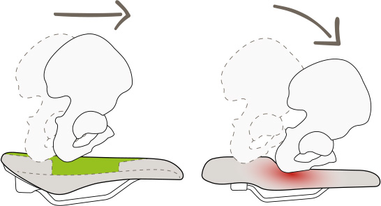 - Sitzfläche: Gleichmäßige Druckverteilung durch eine an den Sitzknochenabstand und die Sitzposition angepasste Sitzfläche.