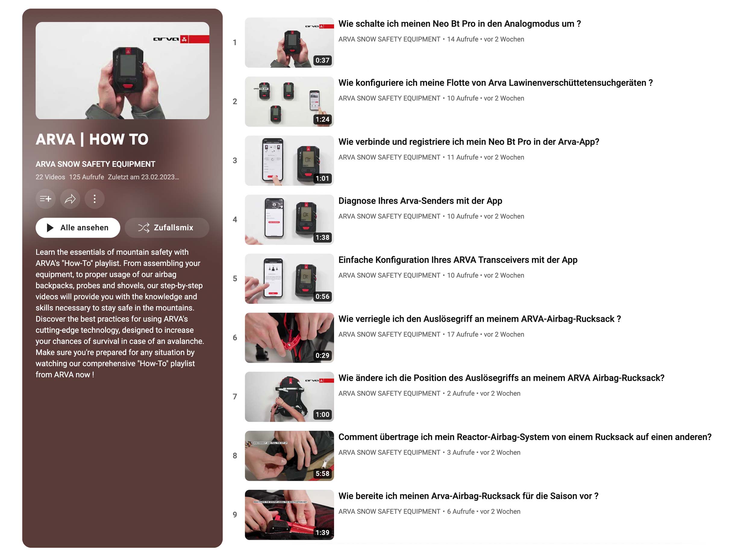 Lernen Sie die Sicherheitsgrundlagen in den Bergen mit der „How-To“-Youtube-Playlist von ARVA. Von der Montage Ihrer Ausrüstung bis hin zur richtigen Verwendung der Arva Airbag-Rucksäcke, Sonden und Schaufeln vermitteln Ihnen die Schritt-für-Schritt-Anleitungsvideos das Wissen und die Fähigkeiten, die Sie für einen sicheren Aufenthalt in den Bergen benötigen.